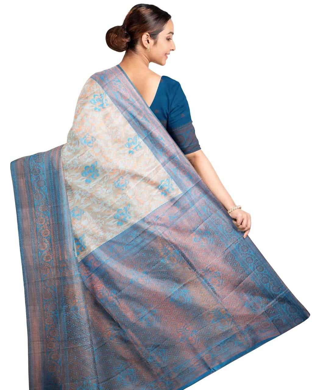 Designed for women who cherish luxury weaves and traditional artistry, this saree is ideal for weddings, festivals, and special ceremonies. The pure handloom silk with zari-woven detailing ensures unmatched durability, shine, and comfort. Its unique copper-and-blue motifs on an ash body make it stand out as a truly distinctive addition to your ethnic collection.